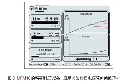 MFM10耐壓試驗過程顯示電壓隨時間的變化曲線,通過陡坡突跳,方便辨認被測電纜外護套故障點數量。